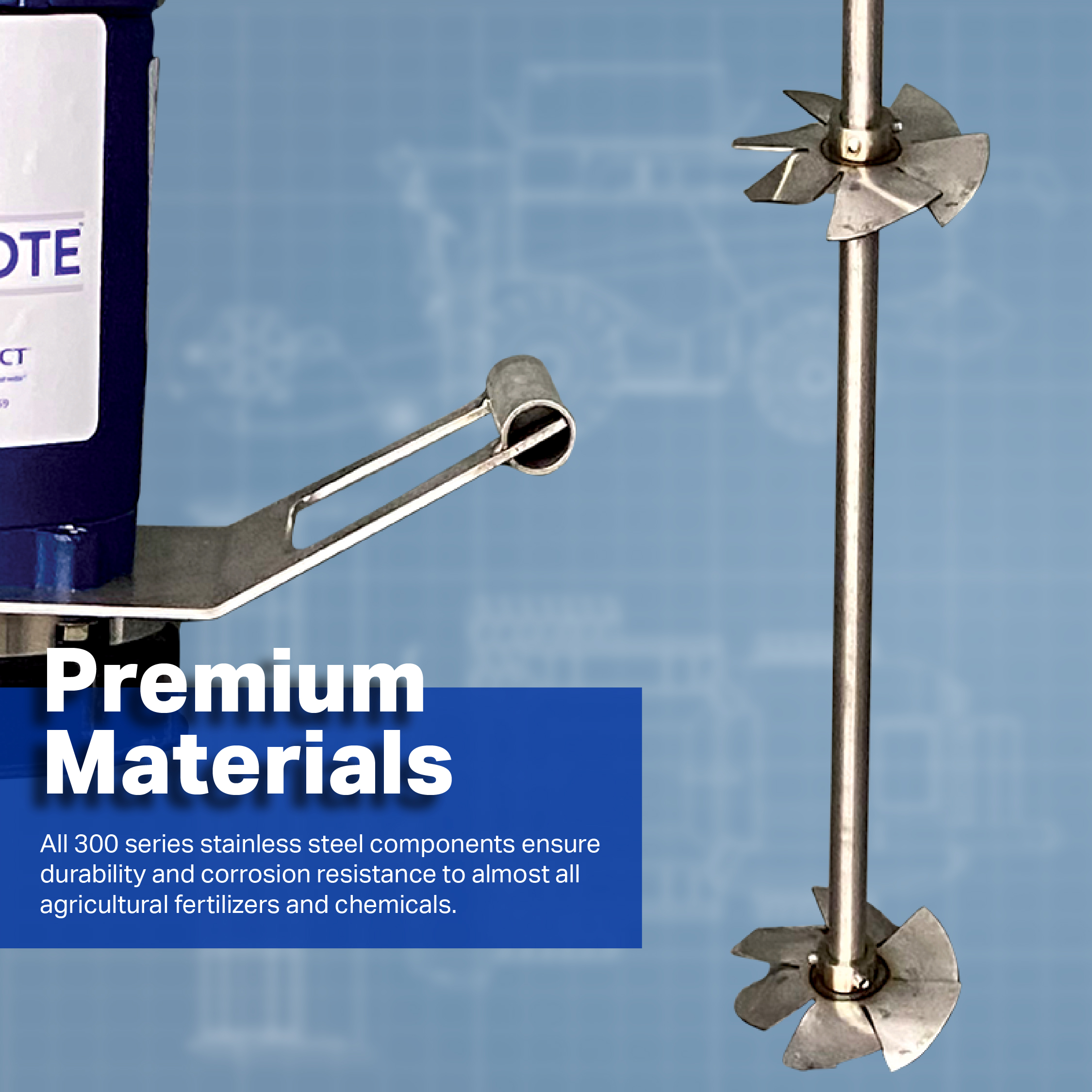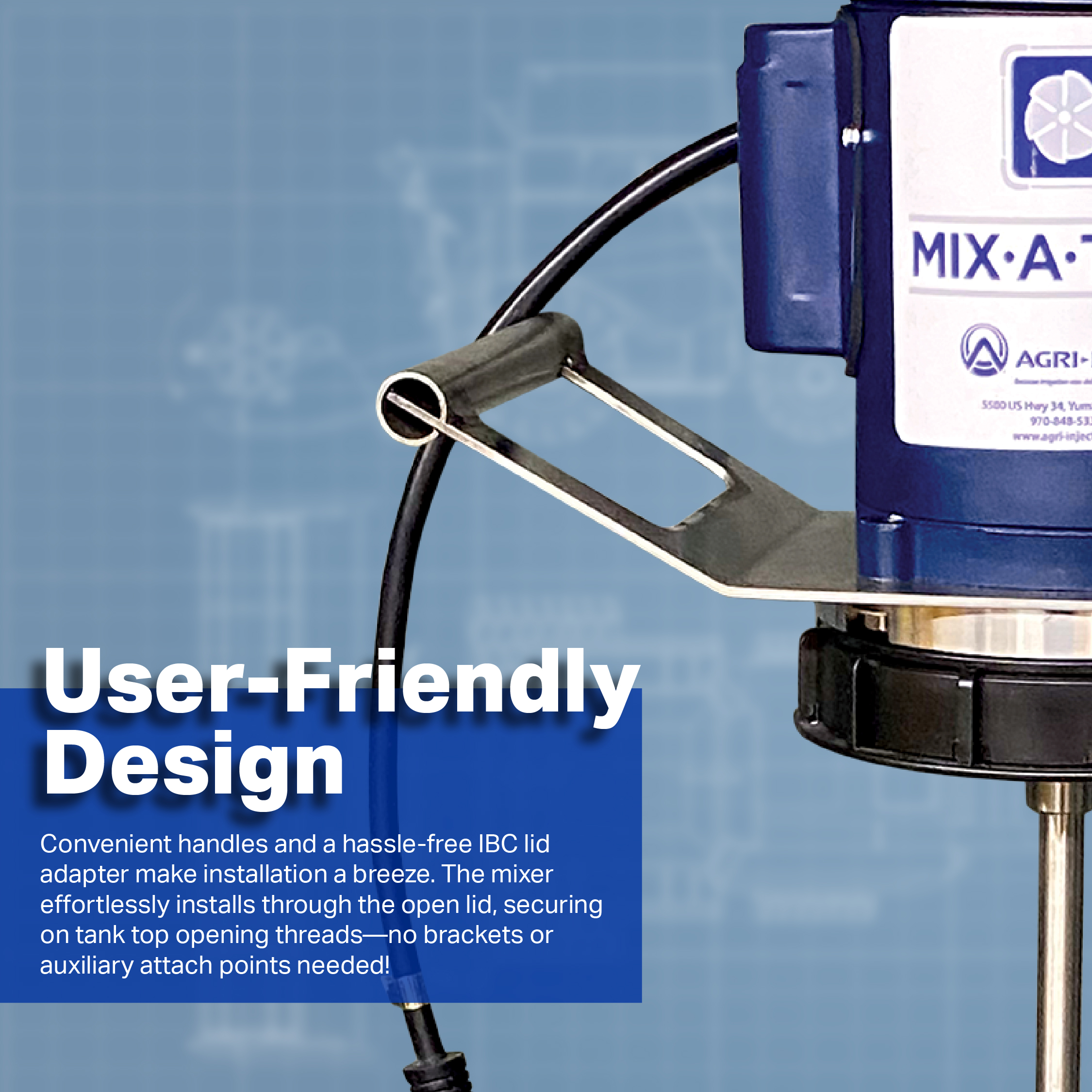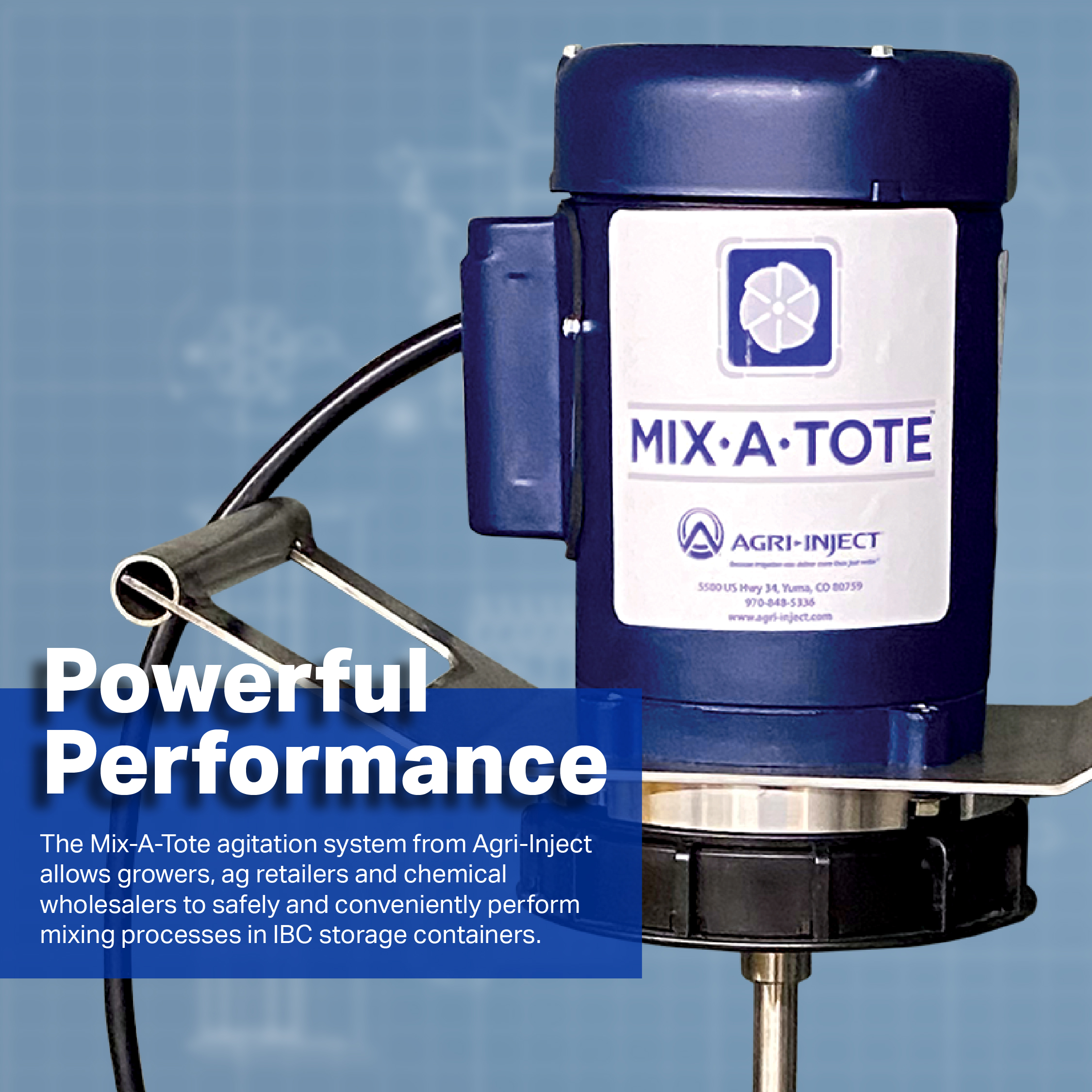The Mix-A-Tote agitation system from Agri-Inject allows growers, ag retailers and chemical wholesalers to safely and conveniently perform mixing processes in IBC storage containers. Agri-Inject develops products that merge quality, efficacy and safety at the highest level and Mix-A-Tote is a prime example.  This product has been carefully designed to perform better than any existing mixing unit and be the simplest and safest to use. Common Uses •   Remixing settled or separated liquids or suspended solids in an IBC tote •   Blending custom mixtures in a tote before transfer to other systems Mixing Efficacy The impellers have been designed to provide thorough agitation. The direction of mixing can be toggled from clockwise to counterclockwise for “up- pumping” agitation, or “down-pumping” agitation as needed, eliminating vortexing and creating an “enveloping effect” within the tank. This helps provide excellent and rigorous mixing — and ensures product that settles at the bottom of the tank can be stirred effectively as well.